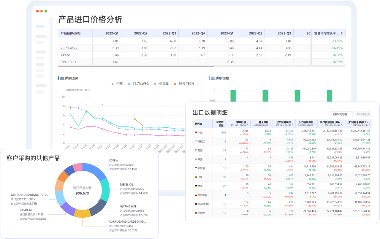 基于100亿+真实贸易数据,结合精准搜索和多元化报告功能,精准分析全球市场变化、定位高价值市场,找到新的业绩增长点。
