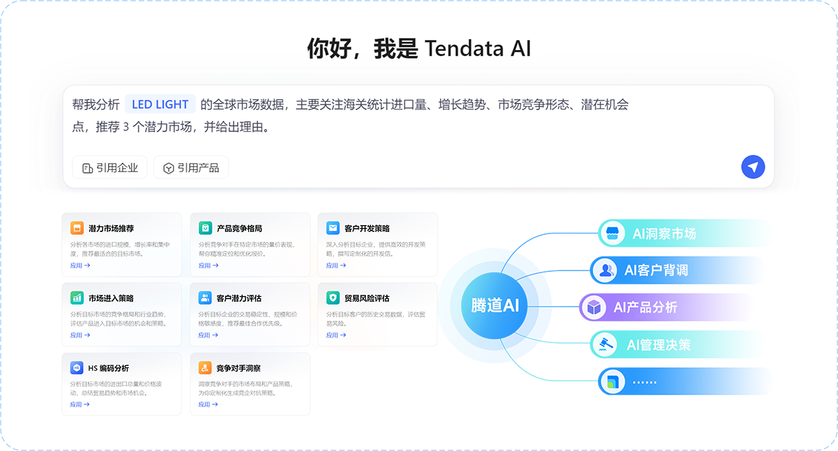 依托AI全新打造的智能、精准的高价值客户开发利器,给予具备全球视野的市场洞察、潜客获取、竞企监测、客户分析等一站式服务