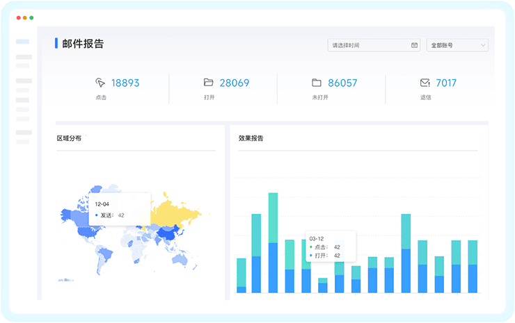 云邮通 一体化邮件发送管理行业独有,海外服务器+动态IP地址,90%高抵达率,内置多种国际化邮件营销模板,支持查看与分析打开率、点击率等数据,助力营销策略优化。