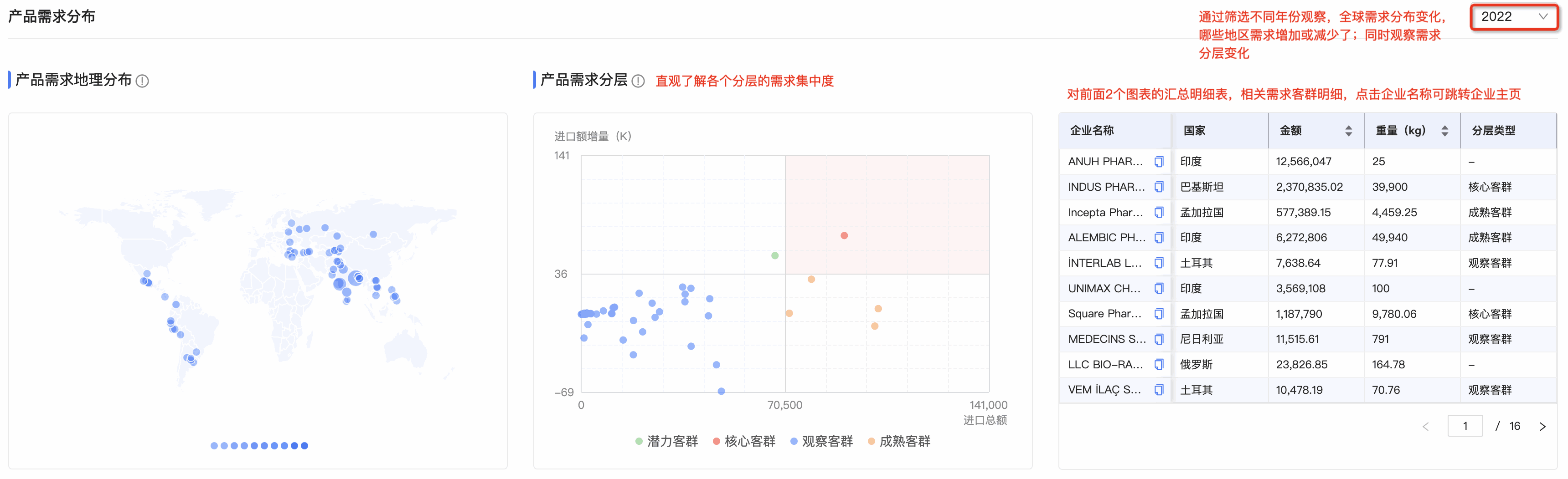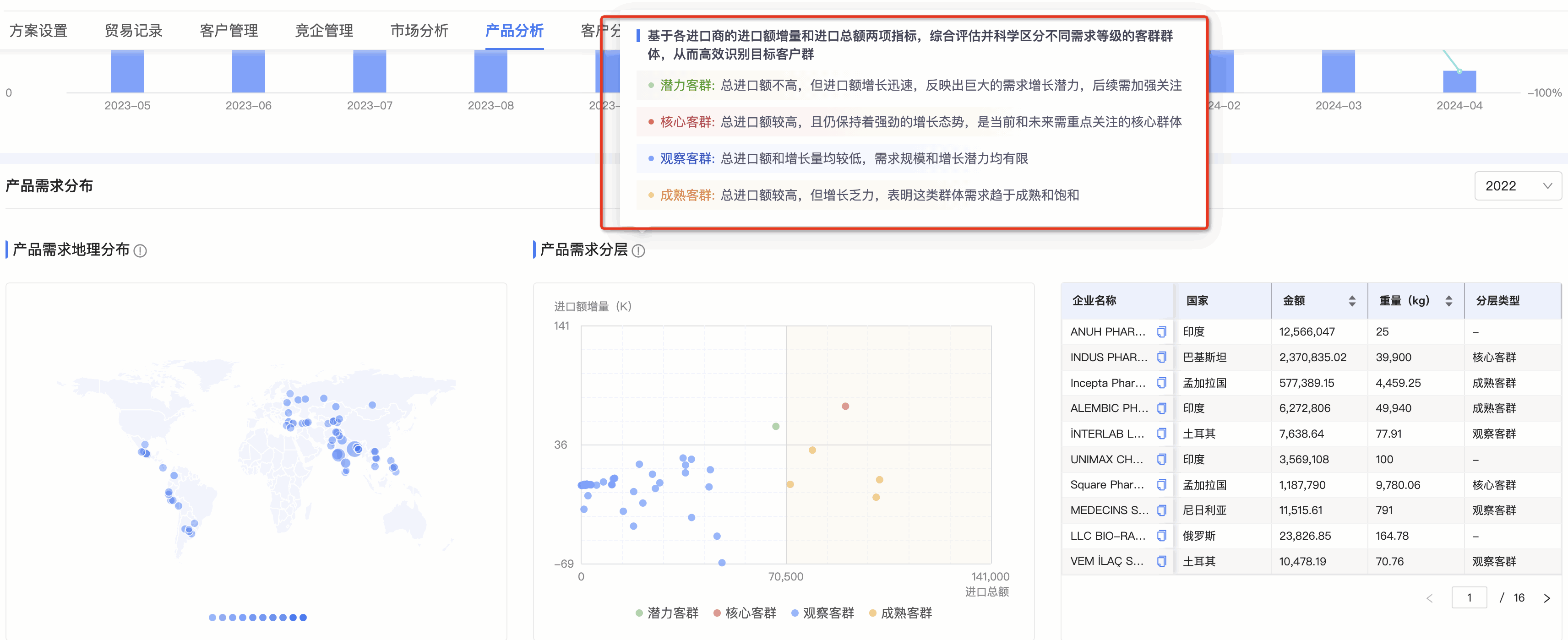 ● 产品需求分层图:J9国际站 J9 数据通将需求客群按照进口额增量和总额进行分层,划分为潜力、观察、成熟和核心四个层级。分层有助于用户快速锁定目标客户群体。标题旁附需求分层的解读,能让用户更直观、快速理解每个层级的特征,能够更快速的识别目标客群。